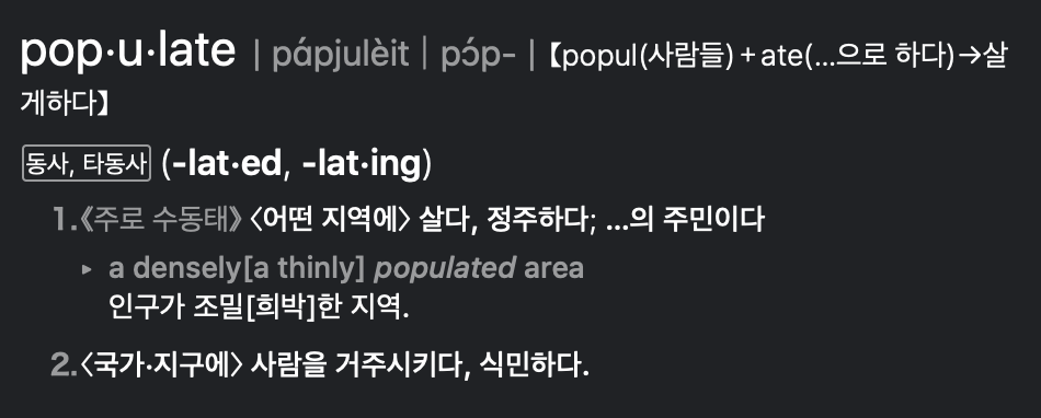 populate의 뜻이 궁금해서 찾아봤는데 거주한다는 의미로 해석하면 대충 이해된다.